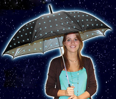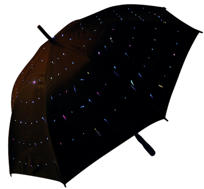 Dieser neue LED Sternen Regenschirm hält Euch nämlich nicht nur trocken, sondern hebt auch noch die Stimmung. Er ist mit vielen kleinen LED-Punkten übersät, die durch über 150 feine Lichtleitfasern in das Schirmgewebe geleitet werden. In der hier angebotenen Version lässt sich entscheiden, ob die LED-Bildpunkte dauerhaft leuchten oder Dauerleuchten oder einen Lichtwechsel der LED-Bildpunkte. Natürlich kann das Licht aber auch komplett ausgeschaltet werden. Im Gegensatz zur Vorgängerversion sind die Lichtpunkte in diesen neuen Modellen sowohl von innen als auch von außen sichtbar. Du kannst den Schirm mit weißen LEDs bestellen.