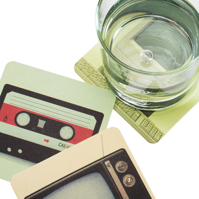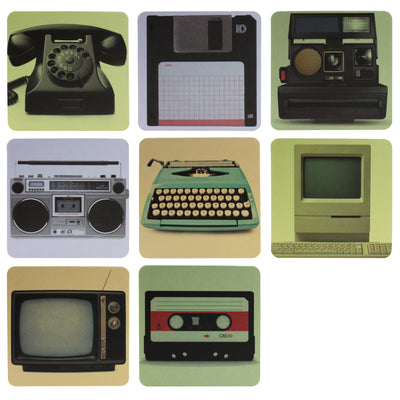 Insgesamt zieren acht verschiedene vorsintflutliche Geräte vor passendem Hintergrund, der an Fotografien aus den 70ern erinnert, die Untersetzer. Machen wir ein kleines Quiz, wozu dienten diese seltsamen Gebilde?