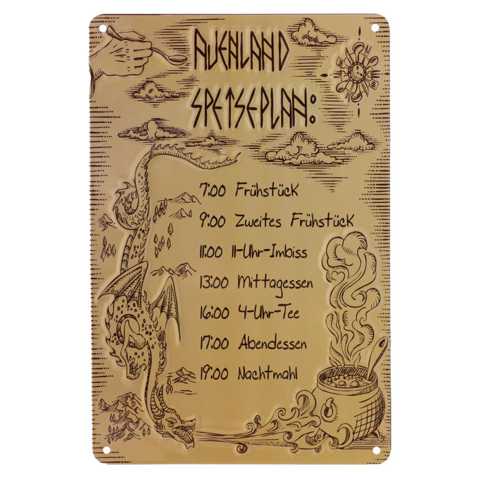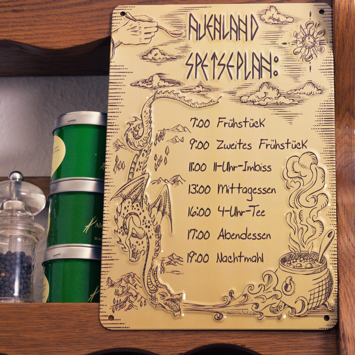 Der Tagesablauf der Halblinge dagegen ist bestens bekannt und genau durchgetaktet. Falls du feststellst, dass die sogenannte Auenland-Diät Auch für dich genau das richtige ist, hilft dir das Blechschild Auenland Speiseplan, um immer auf dem Laufenden zu bleiben, welche Mahlzeit als nächstes ansteht. Immerhin müssen die meisten davon vorbereitet oder gekocht werden, sodass du am besten ein bis zwei Stunden vorher keine Termine mehr haben solltest.