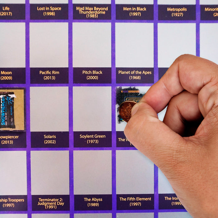 Diese und noch viele weitere Fragen erkunden die Filme auf dem Rubbelposter Science Fiction-Filme. Auf dem farbenfrohen Poster findest du 60 Science Fiction-Filme von A bis Z – na gut, von Akira bis WALL-E –, die du als Science Fiction-Fan gesehen haben solltest. Wenn du einen der Filme gesehen hast, kannst du sein Feld auf dem Poster mit einer Münze freikratzen und ein Item oder ein Symbol aus dem Film offenlegen.