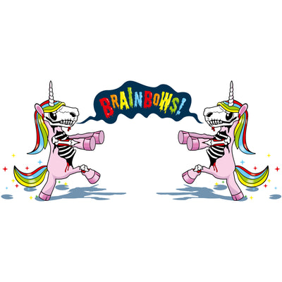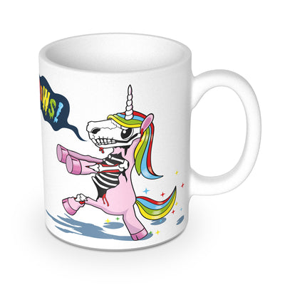 The Brainbows Zombiecorn Mug depicts the next step in the degeneration of mythical creatures: they shuffle around, fall apart, and groan for what they love the most: brainbows. We don't exactly know how the zombiecorns connect brains with rainbows, and to be honest, we don't really want to. If you hear the word brainbows outside of this mug, you better start running...
