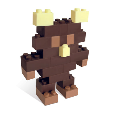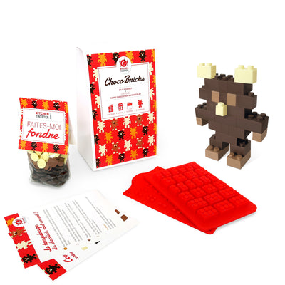In addition to a silicone mold with which you can make studded building blocks, the kit also contains multilingual instructions and fine melting chocolate cookies in white, brown and black. Now all you have to do is melt the chocolate in a bain-marie, pour it into the mold and wait.