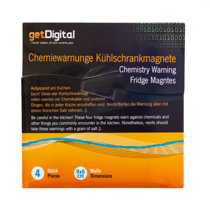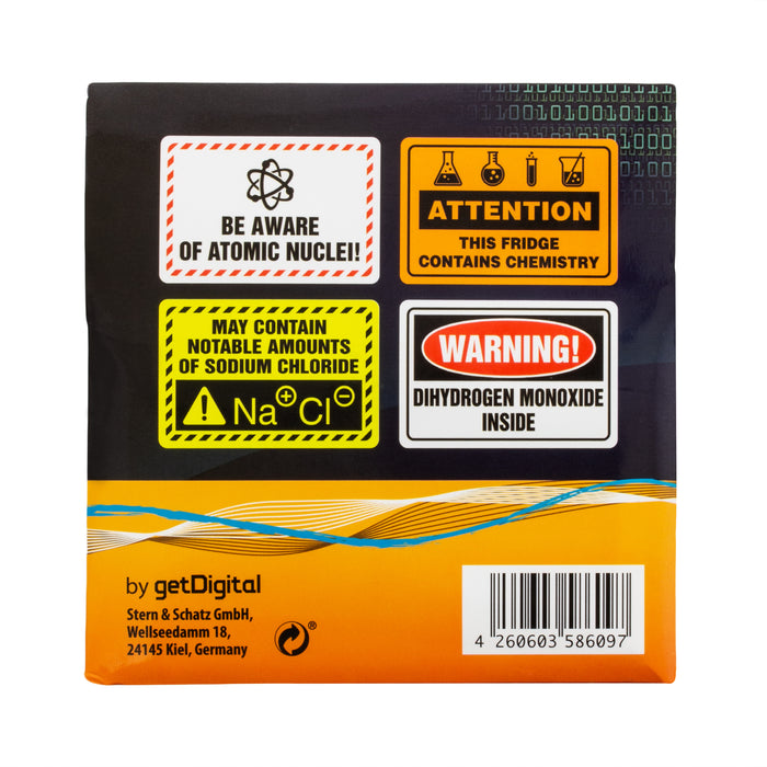 You can also get up to all sorts of mischief in the kitchen at home with the chemical warning fridge magnets. This set contains four colorful fridge magnets that look like warning signs from the chemistry lab and warn of the following things: dihydrogen monoxide, chemistry, sodium chloride and atomic nuclei.