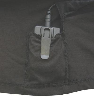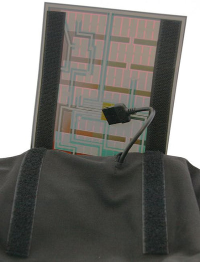 El ecualizador se realiza mediante un accesorio de plástico blando que se fija a la camiseta con velcro. El accesorio se alimenta con una caja de baterías que se puede insertar en un bolsillo cosido en el interior (ver más imágenes).