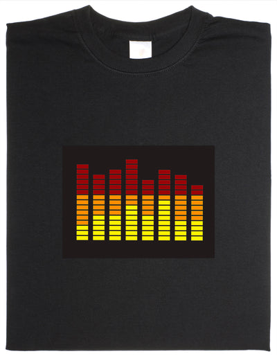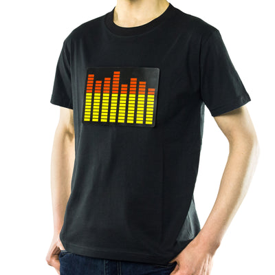 Esta camiseta de ecualizador viene con un ecualizador gráfico incorporado: las barras en el frente de la camiseta se mueven al ritmo de los sonidos de fondo y muestran los sonidos que llegan. Así que es similar a un ecualizador normal. Perfecto para conciertos, discotecas o simplemente la próxima reunión geek. Como se puede ajustar la sensibilidad de la camiseta, puede mostrar desde conversaciones hasta música de discoteca.