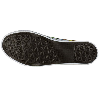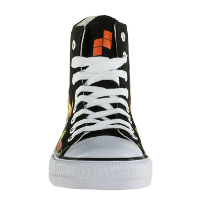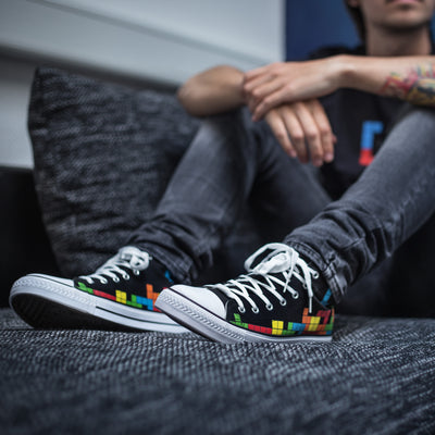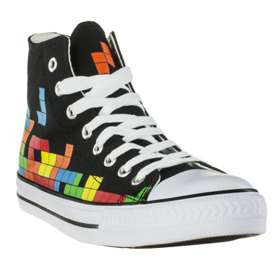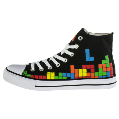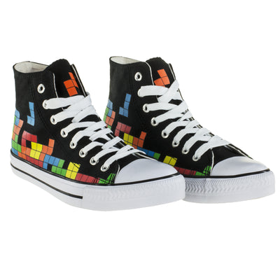 El diseño de las zapatillas es clásica y simple: la suela blanca, la tapa de goma y los cordones se destacan del textil negro. Los zapatos están altos del tobillo y tienen ocho ojales. La colorida presión con el popular juego de apilamiento se adapta al estilo atemporal. ;) Además de los bloques que ya se han apilado, en los que una pieza L se está hundiendo, la pestaña, por así decirlo, representa la vista previa del siguiente bloque, aquí hay un bloque de Z naranja, que puede También use para el próximo tren. :)