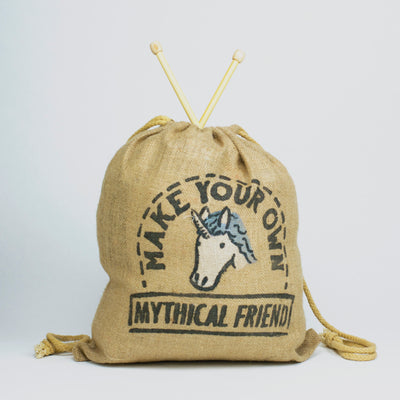 El set, que se entrega en una bolsa de yute impresa, incluyó todo lo que necesita para tejer: tres colores diferentes (para la cabeza, la melena y la bocina), material de llenado, ojos, agujas de tejer y un tablero para el montaje de la pared del terminado trofeo. ¡Ah, y una instrucción detallada y las fotos, por supuesto, no deberían faltar! El conjunto también está dirigido a principiantes, pero es una ventaja dominar las técnicas básicas.