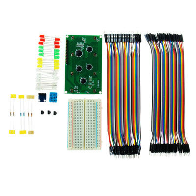 Contenido: Manual (alemán), placa, LED, resistencias, pantalla, cable de puta, sensores y botones. Raspberry Pi no incluida.