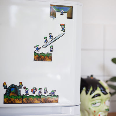 Las partes de nivel se perforan en una estera magnética flexible. Por lo tanto, puede adjuntar las figuras en su refrigerador o pizarra, por ejemplo, y hacer que el nivel sea aún más emocionante con algunas notas o fórmulas de compras. :)