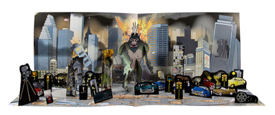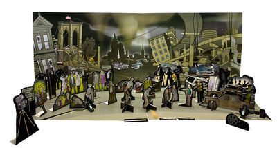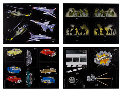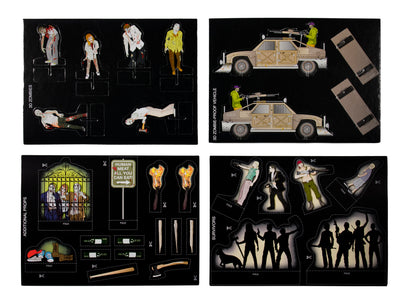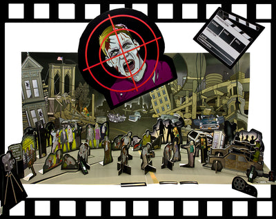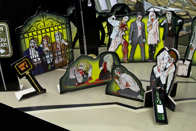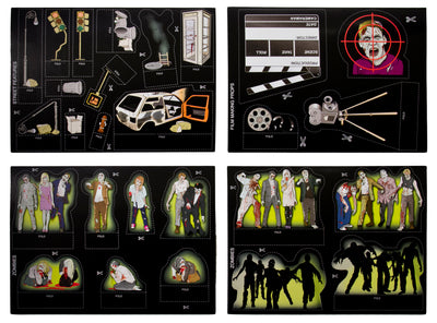 En los diferentes sets con temas de zombies y monstruos, cada uno contiene más de 50 piezas que hacen que montar un escenario completo sea muy fácil. Los accesorios hechos de cartón resistente se pueden animar con palitos delgados (incluidos en el set). Pero, por supuesto, también puedes desarrollar una película de stop-motion ;)