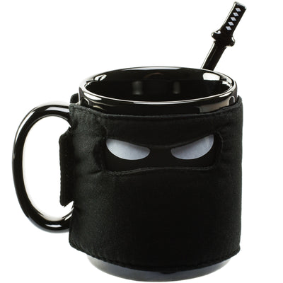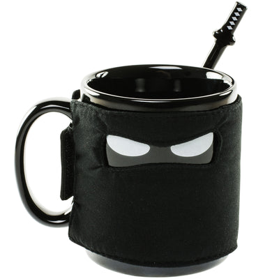 La taza en sí es bastante simple. Solo dos ojos de ninja gruñones advierten a todos que no roben tu bebida caliente favorita. Para un mejor camuflaje y una mayor retención de calor, puedes ponerle una máscara a la taza. Muy fácil con cierre de velcro, todo se puede lavar por separado sin problemas. :) Además, puedes poner la cuchara con empuñadura de espada en el bolsillo lateral de la capucha. Así todos verán que el ninja tiene su espada lista en la espalda.
