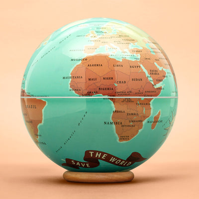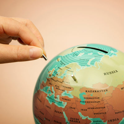 Con el Fondo de viaje "Save the World" ¡Los zorros de centavo (casi) se van! Esta caja de dinero de metal se modela en un globo retro y se puede llenar cómodamente con monedas, brillo y otros objetos de valor estrechos a través de una hendidura en la parte superior. Para que nunca olvide por qué realmente dejas a un lado todo tu cambio, ¡puedes escribir tu próximo destino de viaje en el mundo con la pluma incluida!