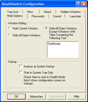 Se puede configurar de manera flexible si se deben ocultar ciertos programas o simplemente todos los programas que se están ejecutando actualmente y qué otro programa debe aparecer en el monitor en su lugar. Los programas ocultos no solo se minimizan, sino que realmente se ocultan, es decir, tampoco aparecen en la barra de tareas. Además, todos los elementos del escritorio se pueden ocultar, los sonidos se pueden silenciar automáticamente y también se puede proteger con contraseña el regreso a las aplicaciones ocultas.