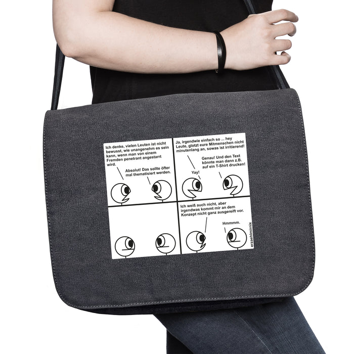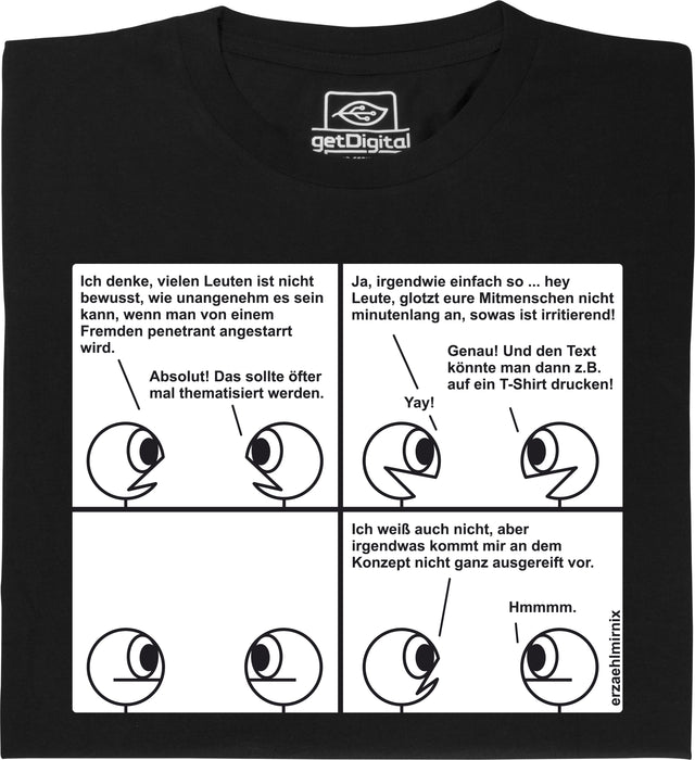 Nadja Hermann la pensa così: Non è il caso! Le due figure sulla maglietta di Erzaehlmirnix discutono quindi su come far capire alle persone che sono maleducate. Una conversazione diretta farebbe degenerare la situazione, ma forse potresti far notare che non ti piace essere fissato con una scritta spiritosa su una maglietta. Ma l'idea non è ancora del tutto chiara. Chi indossa le magliette? ;)