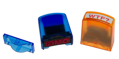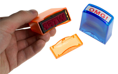 I timbri TXT sono autoinchiostranti e quindi non richiedono un tampone d'inchiostro. Entrambi sono riempiti con inchiostro rosso. Gli alloggiamenti dei francobolli sono in plastica arancione o blu e hanno un tappo protettivo da rimuovere, sul quale i francobolli devono essere tenuti in posizione verticale in modo che l'inchiostro possa scorrere facilmente. I timbri TXT sono disponibili solo in set da due con un timbro OMG! e un timbro WTF?