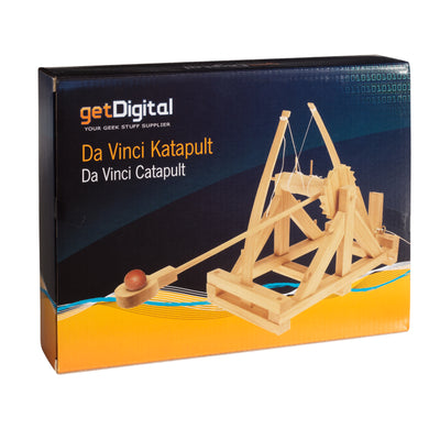 Le kit contient 50 pièces, dont des morceaux de bois, de la colle, des cordes et des crochets à vis, bref, tout ce dont tu as besoin. Bien assemblées, elles forment une catapulte entièrement fonctionnelle. Tu peux ensuite former de petites boules avec l'argile fournie et tester ta précision en essayant de les catapulter dans un récipient par exemple (ou dans le café de ce nouvel employé énervant). La portée est de 4,5 mètres maximum.