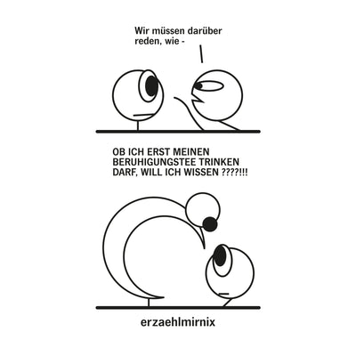 Die Sache mit Beruhigungstee ist ja, dass dieser auch erstmal in Ruhe getrunken werden muss. Und dann muss er erst noch in Ruhe vom Körper aufgenommen werden. Du merkst schon: Auf „in Ruhe“ kommt es an! Aber wie der erzaehlmirnix-Becher „Beruhigungstee“ zeigt, respektiert nicht jeder Mensch diese ungeschriebene Regel des Miteinanders. Dabei ist es doch ganz einfach: Mund halten, bis der Beruhigungstee getrunken ist. Dann sicherheitshalber noch länger den Mund halten. Und dann noch bis zum Feierabend warten. ;)