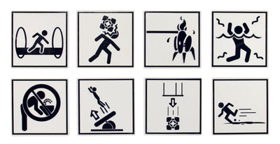 • Afgebeeld zijn waarschuwingsborden uit het spel Portal.