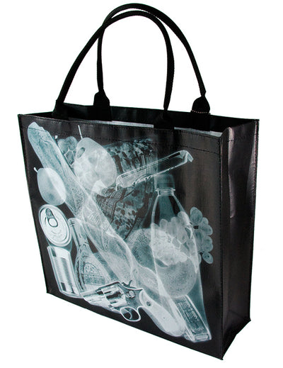 Bespaar de vriendelijke veiligheidsbeambte de controle van je tas door deze boodschappentas met een afdruk van de inhoud in typische röntgenweergave te gebruiken. Je moet misschien wel een goede uitleg klaar hebben voor het pistool...