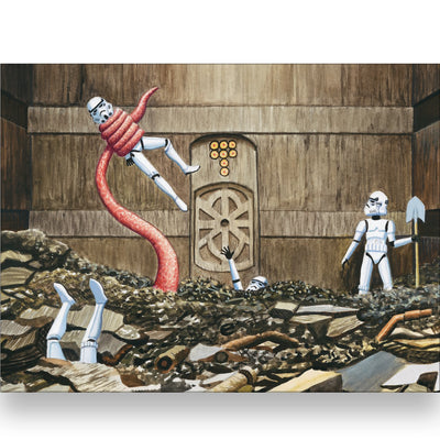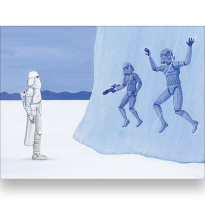 • Handgeschilderde afbeeldingen tonen op humoristische wijze wat de Stormtroopers overkomt