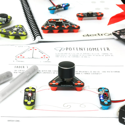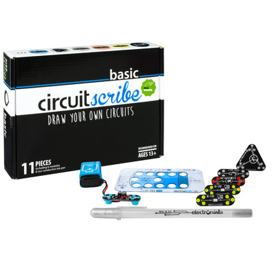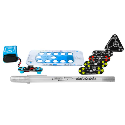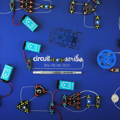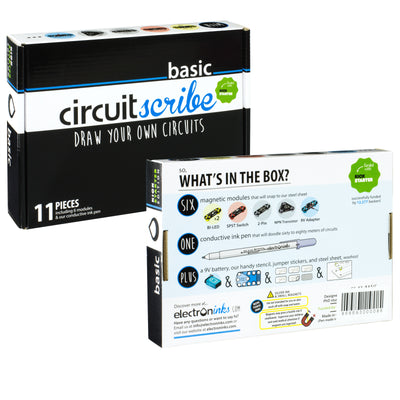 • Stylo à encre argentée conductrice pour dessiner des circuits entièrement fonctionnels sur papier;- ; Avec divers modules comme des lampes LED, des interrupteurs, des transistors et des résistances;- ; Les modules ont des pieds magnétiques et sont ainsi maintenus en place sur la plaque d'acier qui est placée sous le papier avec le circuit.
