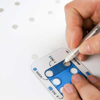 Ensuite, tu as bien sûr besoin de courant. Pour que tous les autres éléments du schéma électrique restent à leur place, les kits (sauf Lite) sont accompagnés d'une plaque en acier que tu places sous le papier. Tous les accessoires du Circuit Scribe sont dotés de pieds magnétiques, ce qui te permet de placer les différentes pièces à leur place. Il est donc plus que facile de modifier le circuit à tout moment ou de l'abandonner complètement. Tu n'as besoin que d'une nouvelle feuille de papier. :) Pour que les distances soient correctes et qu'il n'y ait pas d'interruptions dans le circuit, tous les kits, sauf Lite, sont livrés avec un gabarit qui indique les différentes distances entre les contacts et te permet de dessiner des connexions parfaitement rondes. Le meilleur moyen de voir comment tout cela fonctionne est de regarder la vidéo à gauche.