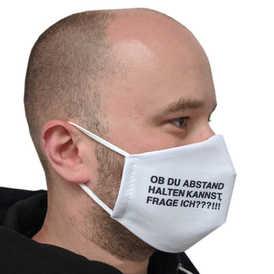 Ce masque en tissu a été fabriqué en Allemagne et se met en un clin d'œil pour dire aux autres QU'ILS DOIVENT SE TENIR DANS LES DISTANCES. Comme la bouche et le nez sont couverts, le masque est considéré comme un "masque de tous les jours", tu peux l'utiliser pour faire du shopping ou pour prendre les transports en commun. Les élastiques pour les oreilles assurent une tenue parfaite. Tu peux bien sûr utiliser le masque après l'avoir porté. Laver à 60°C.