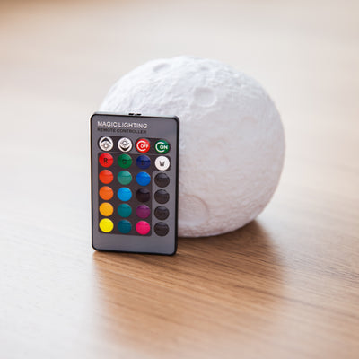 La petite réplique lumineuse de la lune n'est bien sûr que réelle avec la structure typique de la surface, les cratères et l'empreinte de Neil Armstrong ! De plus, quelques fonctionnalités cool ont été ajoutées à la lune. Avec une télécommande, tu peux facilement allumer et éteindre la lumière de la lune, choisir entre 16 couleurs différentes et 4 programmes de changement de couleur et régler l'intensité de la lumière.