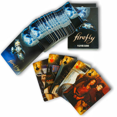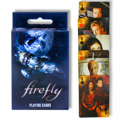 Bien sûr, il y a aussi du temps pour jouer aux cartes. Pour cela, les cartes à jouer « Firefly » sont parfaites. Avec les 54 cartes, y compris 2 jokers, tu peux t'amuser avec tes compagnons de voyage même les jours les plus ennuyeux. De plus, les visages de tous les membres de l'équipage sont imprimés sur les cartes les plus hautes et les jokers. Ainsi, tu pourras peut-être mieux te rappeler de quel côté tu es lorsque nous aurons à nouveau des ennuis avec l'Alliance, que nous serons attaqués par des Reavers ou que nous nous retrouverons dans d'autres pétrins.