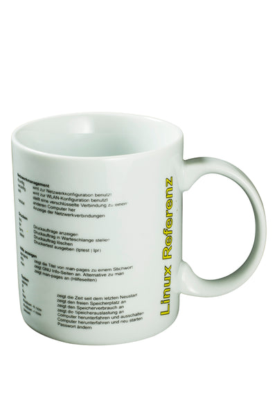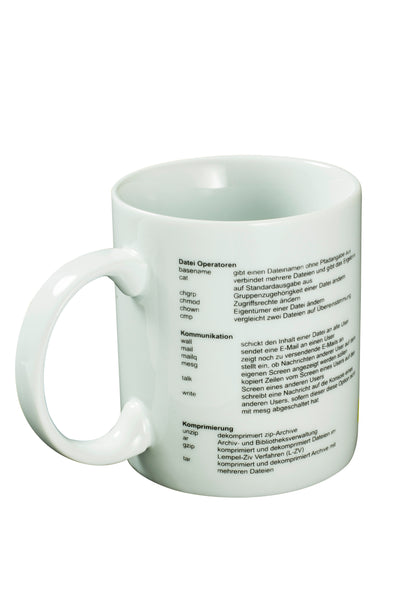 Sur cette tasse sont imprimées des commandes importantes de Linux, de sorte que vous pouvez apprendre et pratiquer confortablement avec un café, un thé ou un cacao chaud à l'ordinateur.
