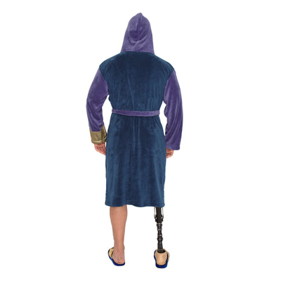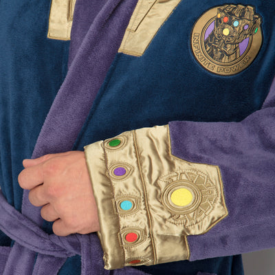 Bien sûr, il porte le "peignoir Marvel Avengers Thanos". Ce vêtement moelleux en taille unique est inspiré de sa tenue dans les films et se distingue non seulement par une capuche et une ceinture, mais aussi par des applications décoratives qui complètent l'illusion d'une armure. Même le Gant de l'Infini figure sur une manche! Bien sûr, avec les Pierres d'Infinité incluses. La prochaine fois que quelqu'un te dérange pendant que tu te détends, tu n'auras qu'à menacer de claquer des doigts! ;)