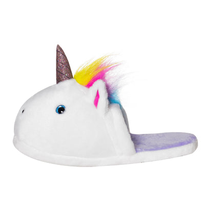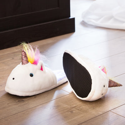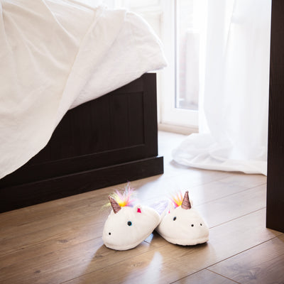 Nous avons également entendu dire que les porteurs de produits licornes ont souvent rapporté l'apparition soudaine d'arcs-en-ciel dans leur maison et de pluies de paillettes ! De plus, la sublime créature mythique te protège toujours des coins et des bords malveillants de ton appartement sur lesquels tu pourrais te cogner les orteils. La semelle noire à picots t'empêche également de glisser au pays des arcs-en-ciel.