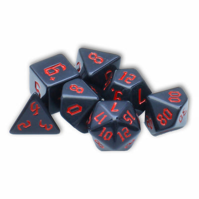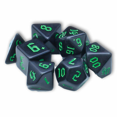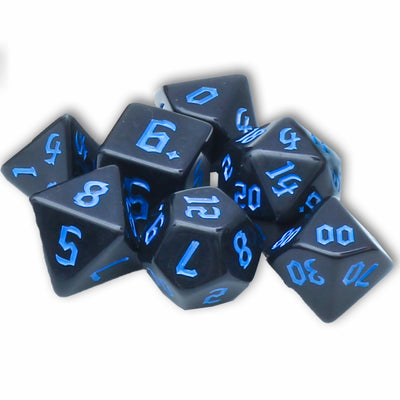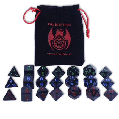 • Ein Beutel enthält sieben schwarze Würfel (W4, W6, W8, W10, W12, W20 und W100) mit farbigen Zahlen