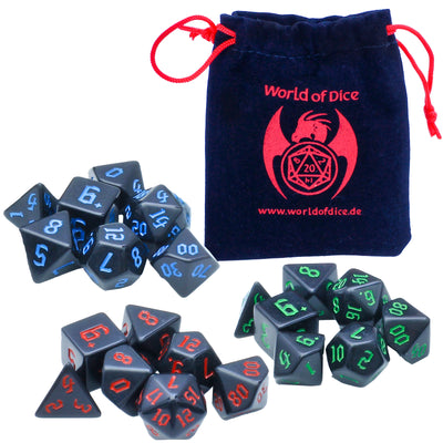 Die RPG Würfel im Beutel sind in schlichtem Schwarz gehalten, sodass die bunten Zahlen noch mehr leuchten und somit leicht zu erkennen sind. Wie es sich für wirklich gute Würfel gehört, liegen sie angenehm in der Hand und lassen sich leicht werfen. Natürlich bekommst du gleich alle sieben Würfelarten, um für jede Art Pen & Paper gerüstet zu sein, egal ob D & D, Shadowrun oder DSA. Der schicke Beutel sorgt dafür, dass du sie jederzeit mitnehmen kannst, wenn das Abenteuer ruft.