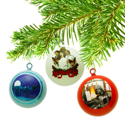 Ce Noël est différent, car avec cet ensemble de boules de Noël Star Wars, nos héros aguerris ont enfin l'occasion unique de jouer à un monde parfait : Han et Leia s'embrassent sous le gui, les AT-AT tirent le traîneau du Père Noël, et Dark Vador joue des chants de Noël au piano, tandis que le feu crépite dans la cheminée. Chaque boule est ornée d'un motif de Noël détaillé et du logo Star Wars, et peut être accrochée aux branches de ton sapin de Noël avec un ruban.