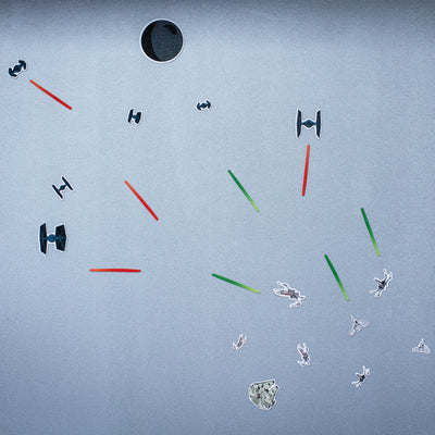Ce set contient 23 motifs magnétiques différents, dont la grande étoile de la mort et 14 vaisseaux spatiaux : X-Wings, TIE Fighter, un Millennium Falcon et plus encore. En plus, quatre rayons laser verts et quatre rayons laser rouges te permettent de créer une petite bataille. Tu peux aussi donner un peu plus de poids à tes notes importantes pour tes colocataires. ;)