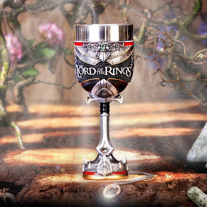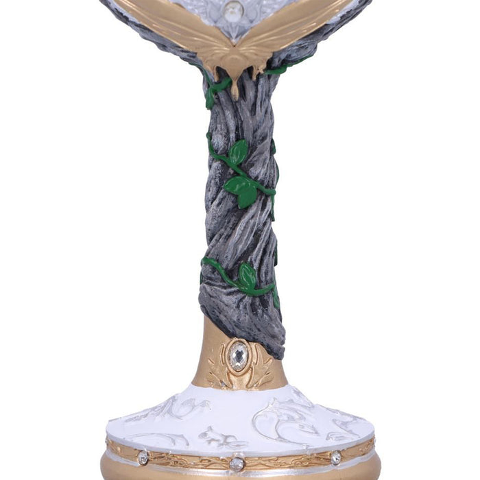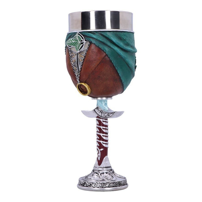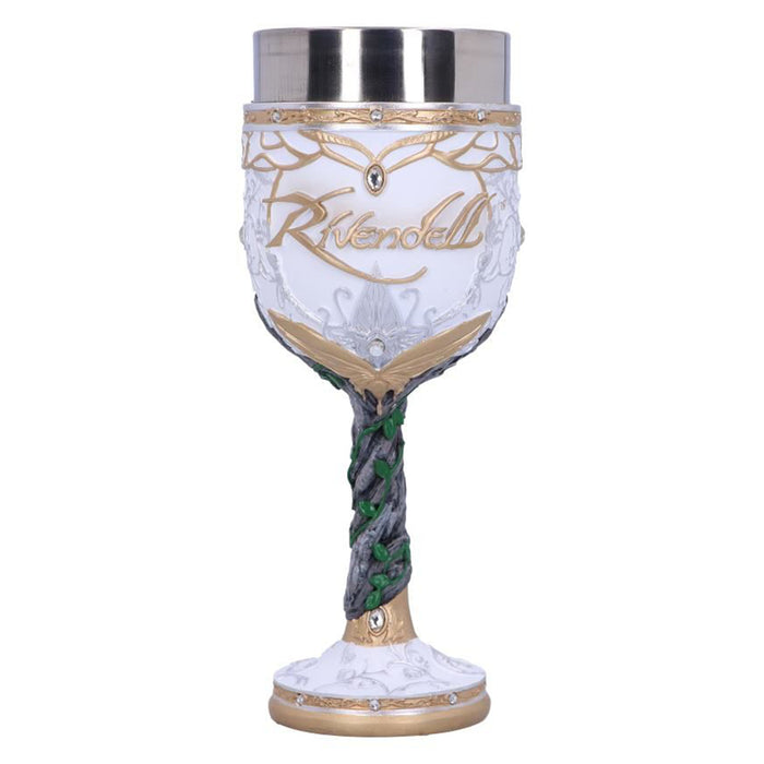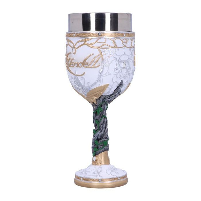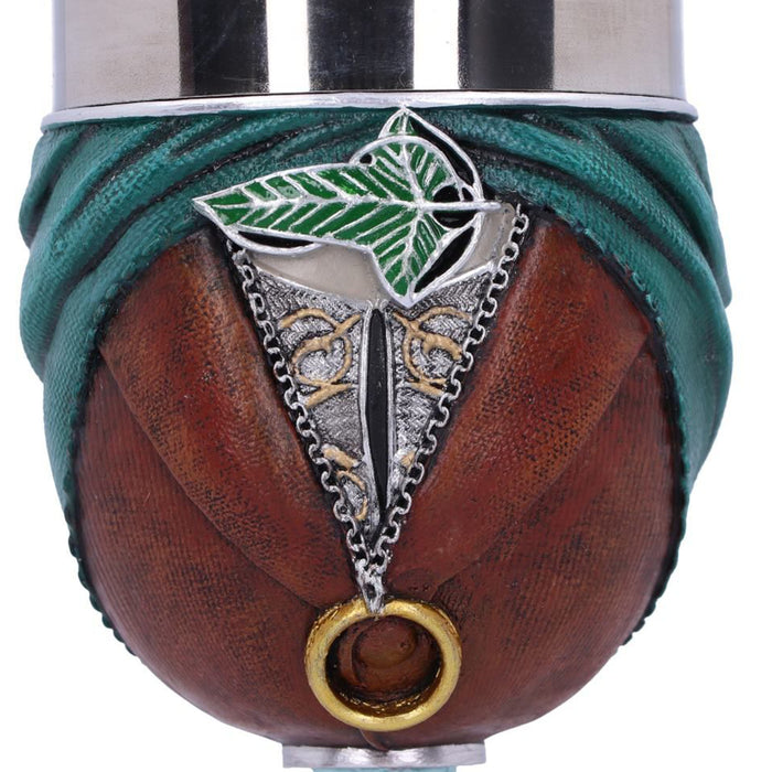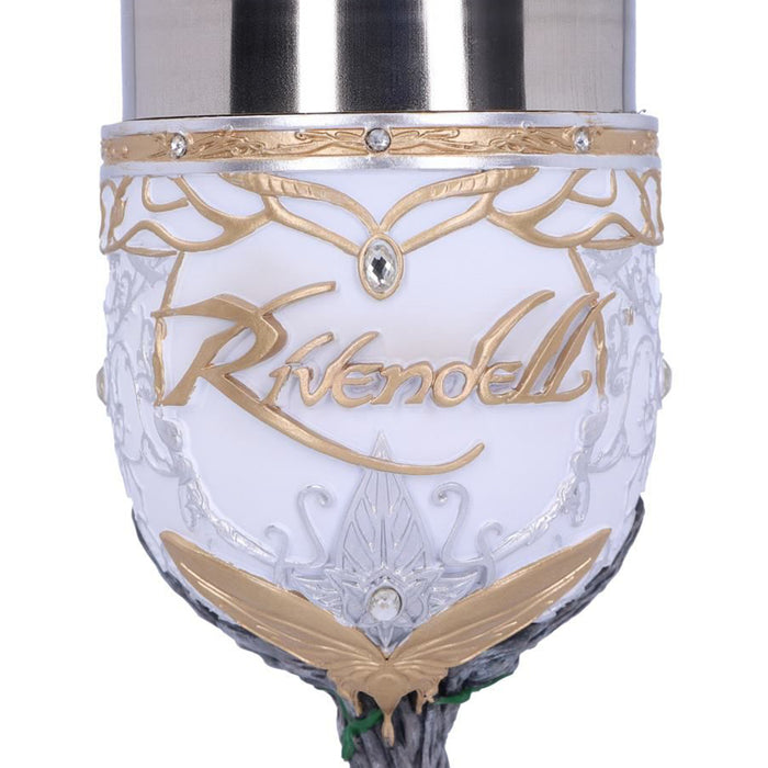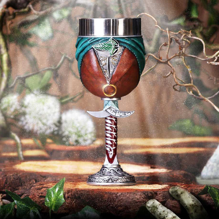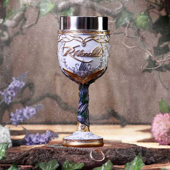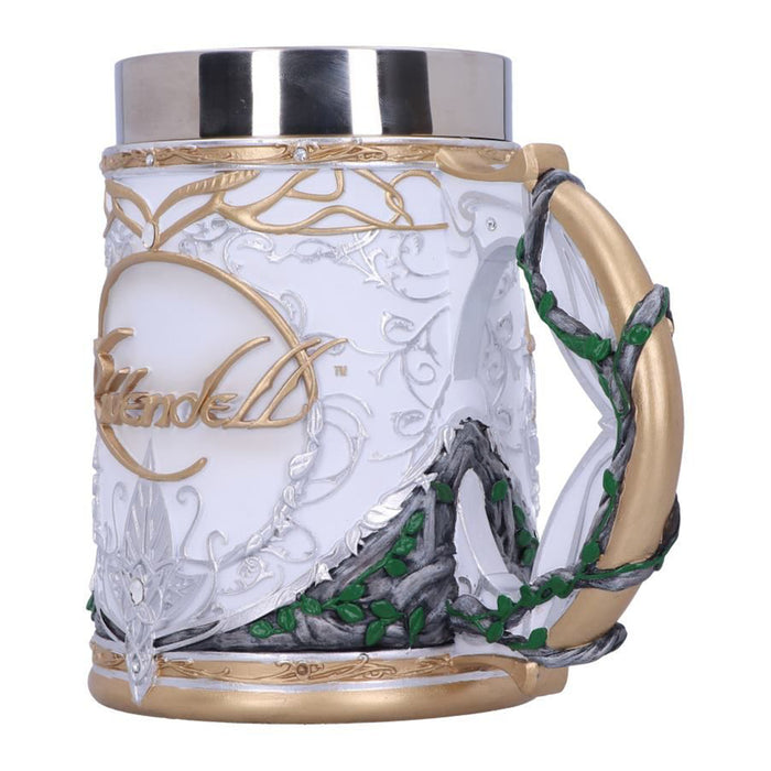 • C'est à Fondcombe que les compagnons se sont rencontrés pour la première fois. Pour Aragorn, cet endroit a une signification particulière, car c'est la maison de sa bien-aimée Arwen. Sa couronne, son étoile du soir et sa feuille de Lórien ornent donc aussi bien la coupe de vin que la chope de bière. Les deux récipients sont d'un blanc éclatant avec des ornements dorés, ornés de plusieurs petits bijoux et de l'inscription "Rivendell", ce qui signifie "Vallée de la Bruche". Des plantes grimpent sur la poignée ou le manche, ce qui illustre le lien des elfes avec la nature.