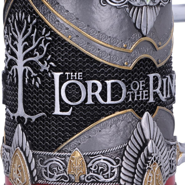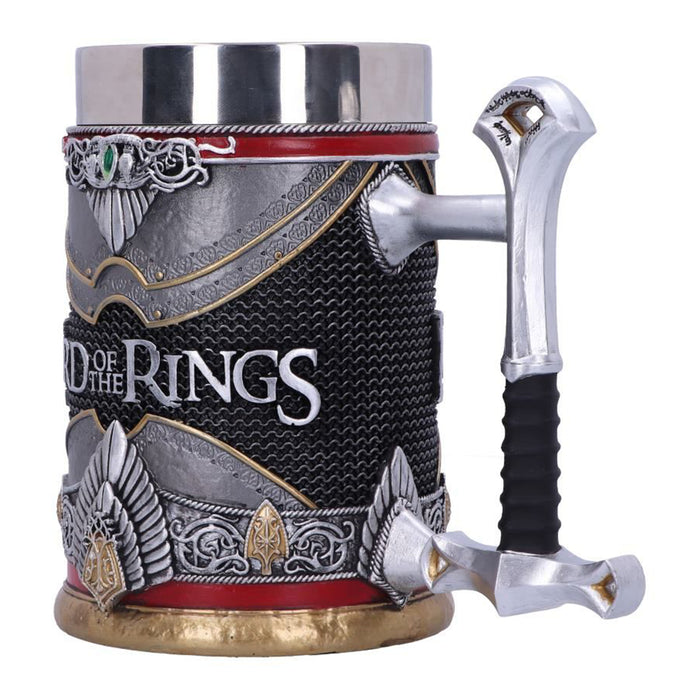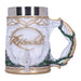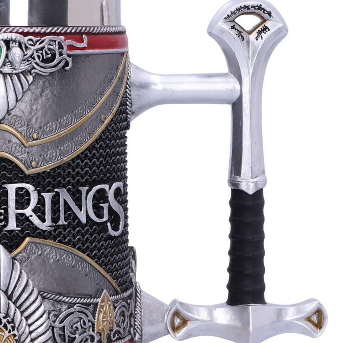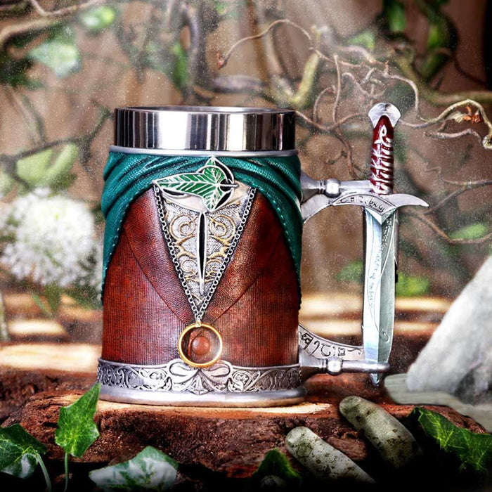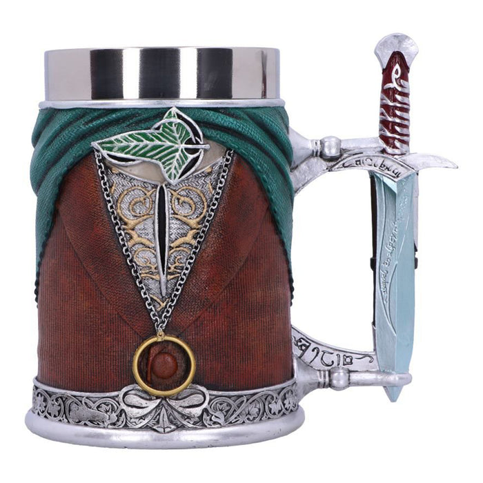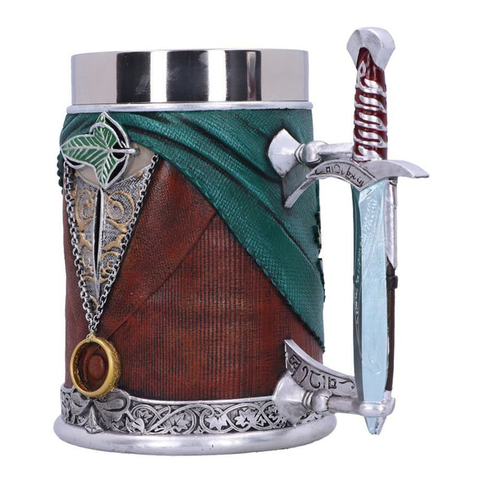 • La meilleure façon de boire, c'est avec de bons amis. Malgré les tensions initiales, les compagnons sont même parfois devenus les meilleurs amis du monde. C'est particulièrement vrai pour Aragorn, Legolas et Gimli. La chope de bière artistiquement travaillée, qui porte également l'inscription "Lord of the Rings", montre les vêtements et les armes préférées des trois guerriers.