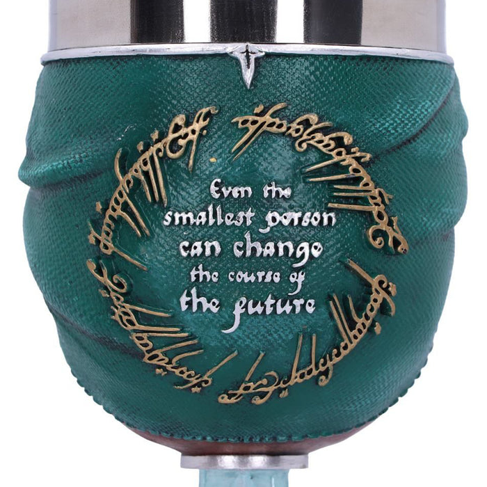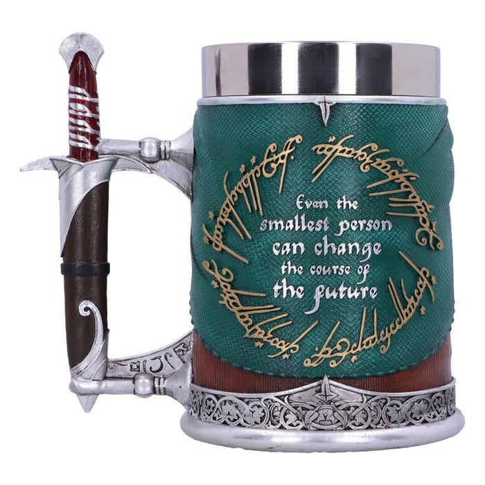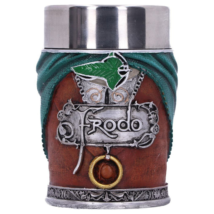 • Le plus grand honneur revient bien sûr au porteur de l'anneau, Frodon Sacquet, qui, avec l'aide de son meilleur ami Sam, a finalement réussi à détruire l'anneau. La chope de bière et la coupe de vin sont conçues sur le modèle de ses vêtements, avec la feuille de Lórien et l'anneau sur le collier. L'anse, ou le manche, montre la gravure de l'épée de Frodo. Son manteau est orné de l'inscription elfique dorée de l'anneau et de la citation : "For even the smallest person can change the course of the future".