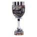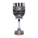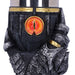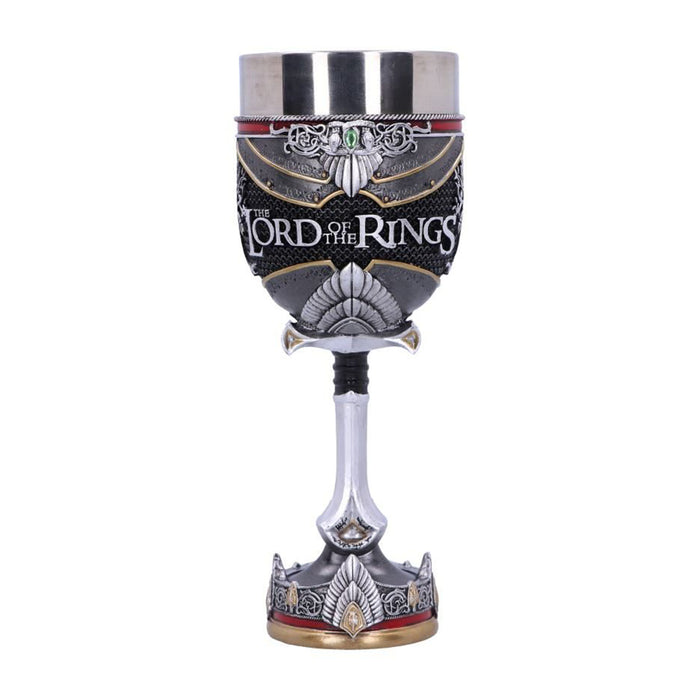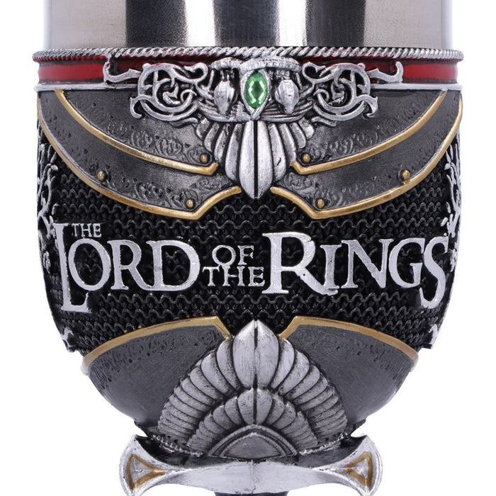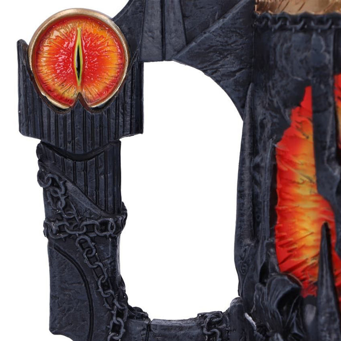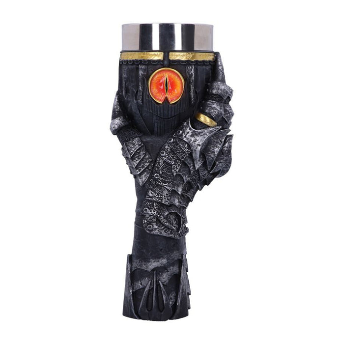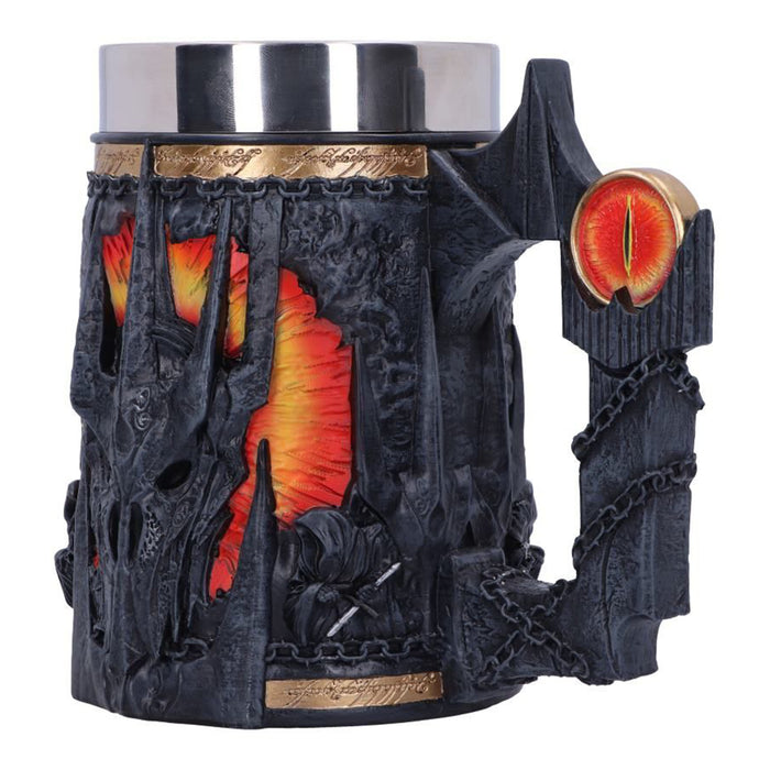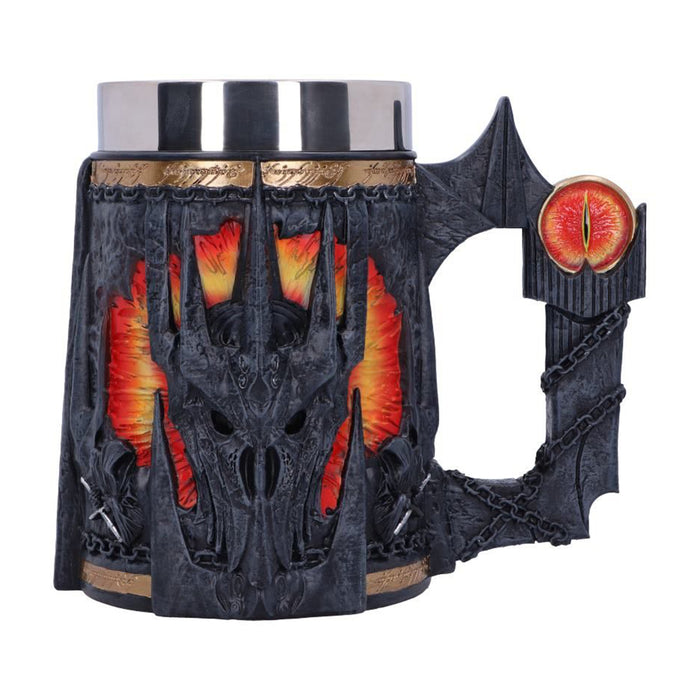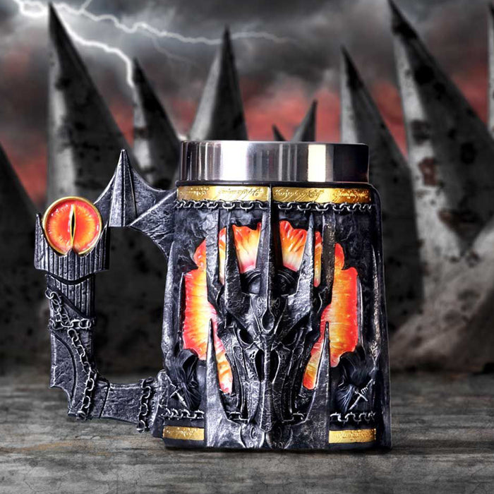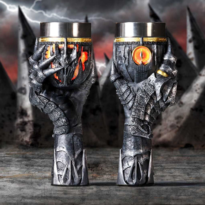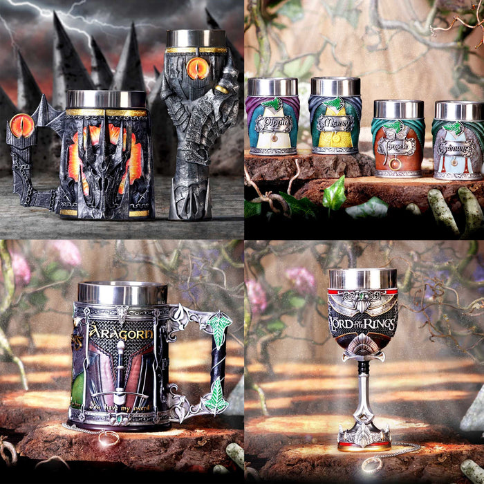 • Même s'il était le méchant de l'histoire, une certaine fascination émanait de Sauron et de son œil sans paupière sur la tour de Barad-dûr. C'est pourquoi il est lui aussi immortalisé dans une chope de bière et une coupe de vin. Les deux portent l'inscription de l'Anneau unique et le casque de Sauron. La coupe de vin est tenue par sa main, l'anneau unique toujours au doigt. L'anse de la chope de bière, quant à elle, est constituée de la tour de Barad-dûr, sur laquelle se trouve l'œil de feu qui surveille de près tes habitudes de consommation.